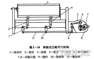(1)消極式凸輪開(kāi)口機(jī)構(gòu):由于凸輪輪廓面形狀可以按照開(kāi)口工藝進(jìn)行設(shè)計(jì),所以凸輪開(kāi)口機(jī)構(gòu)的運(yùn)動(dòng)性質(zhì)可以彌補(bǔ)連桿開(kāi)口機(jī)構(gòu)運(yùn)動(dòng)性質(zhì)難以改變的不足,拓展了織物的適應(yīng)性。它不僅能織制平紋、斜紋和緞紋,而且可以織造燈芯絨及某些復(fù)合組織的織物。因此是用戶廣泛采用的開(kāi)口型式(圖2—15)。