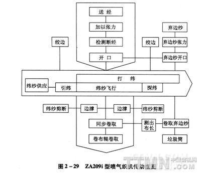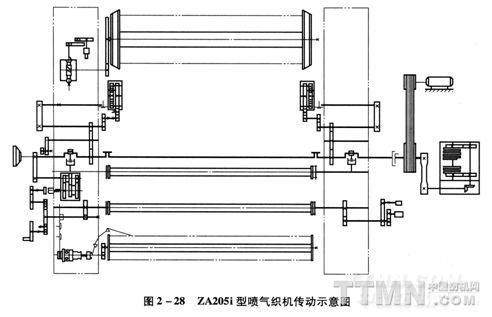 ZA200系列噴氣織機(jī)傳動(dòng)系統(tǒng):電動(dòng)機(jī)通過三角帶將動(dòng)力傳遞給織機(jī)主軸,主軸再傳遞給織機(jī)上的各個(gè)機(jī)構(gòu)。織機(jī)在點(diǎn)動(dòng)和自動(dòng)尋緯期間的運(yùn)動(dòng)是通過5 Hz變頻電源驅(qū)動(dòng)主電動(dòng)機(jī),然后主電動(dòng)機(jī)再將動(dòng)力傳遞給織機(jī)各個(gè)機(jī)構(gòu)。
