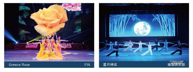 《Greece rose》音樂響起來,Fin ladies 翩翩起舞,舞姿輕柔,笑容明媚。色彩明艷的長裙在舞臺上極盡優雅的線條,藍色紗幔將柔美演繹得如夢如幻,淋漓盡致。