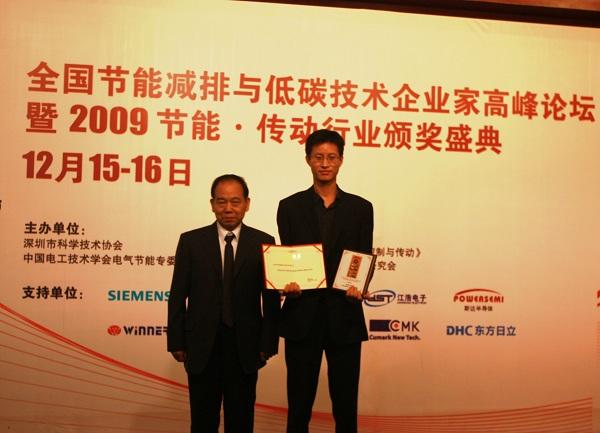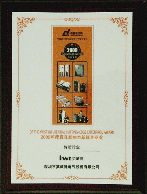 12月15日,“2009年全國節能減排與低碳技術企業家高峰論壇暨2009節能• 傳動行業頒獎盛典”在深圳市海景奧思廷酒店海宴堂隆重召開。深圳市英威騰電氣股份有限公司獨攬“2009年度傳動行業最具影響力新銳企業獎”及“2009年度傳動行業傳動產品國內領先品牌獎”兩項獎項。