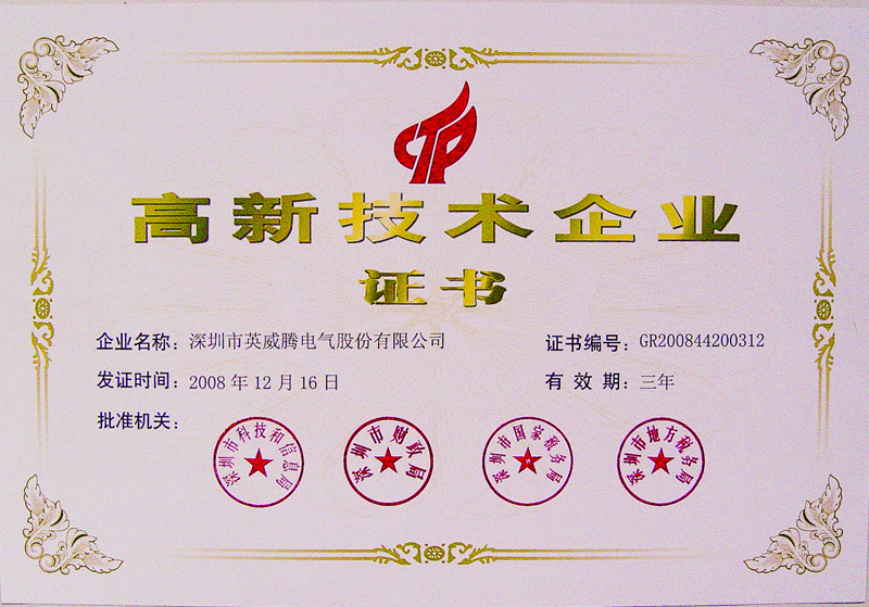 在國家重點支持的高新技術領域,持續(xù)進行研究開發(fā)與技術成果轉化,形成企業(yè)核心自主知識產(chǎn)權,并以此為基礎開展經(jīng)營活動,重大高新技術成果轉化項目的技術水平屬于國內領先或國際先進的企業(yè),經(jīng)企業(yè)報審通過后,才能被認定為“國家級高新技術企業(yè)”。國家對高科技自主研發(fā)的發(fā)展高度重視,在2008年科技部、財政部、國家稅務總局聯(lián)合下發(fā)新的《高新技術企業(yè)認定管理辦法》中,提高了國家級高新技術企業(yè)認定的標準和門檻,對企業(yè)擁有核心技術的自主知識產(chǎn)權、員工素質和企業(yè)贏利這幾方面來作為硬指標。能夠被認定為“國家級高新技術企業(yè)”是一個企業(yè)科技實力和科技水平的綜合體現(xiàn),英威騰能達到要求的高標準、通過認證,充分證明了英威騰的高科技領先水平及企業(yè)的綜合實力。
