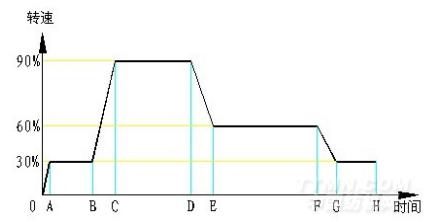 正常情況下,該鍋爐每55分鐘為一個生產周期,生產過程的不同階段,電爐產生的煙氣量不同,因此需要調節(jié)除塵風機的風量。按照正常的生產過程,為滿足生產工藝的要求,除塵系統(tǒng)的除塵量可以按如圖一所示調節(jié)。一個周期可分為4個階段:1、加料A~B,9分鐘;2、供電供氧高速C~D,15分鐘, 3、供電供氧中速E~F,25分鐘;4、出爐低速G~H,6分鐘。