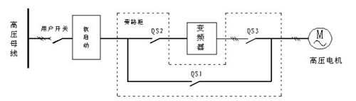 根據(jù)現(xiàn)場的運行工藝要求,考慮到變頻器退出運行后,為了不影響生產,確保除塵系統(tǒng)正常工作,我公司為系統(tǒng)配置工頻旁路,保留了以前的工頻啟動的軟啟動裝置,同時按照以往的保護定值進行整定,當變頻器出現(xiàn)異常時,將電機投切到工頻下運行。整個調速系統(tǒng)的一次回路圖如下所示: