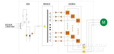 CHH100系列高壓變頻器一體化設計,系統(tǒng)屬于高—高結構方式,變頻裝置逆變主電路拓撲采用單元串聯(lián)多電平電壓源型變頻器,由變壓器柜、功率柜、控制柜、自動旁路柜四個部分組成,通過將多個低壓功率模塊的輸出疊加起來得到高壓輸出,可以直接配套異步鼠籠電機。CHH100系列高壓大功率變頻器的原理結構如圖三所示。電網送來的三相10KV交流電,經移相變壓器,由其副邊每相的9個二次線圈電壓逐個移相6.5°,供電給9個功率單元,三相共27個功率單元,形成Y聯(lián)結結構。變頻器控制部分采用DSP處理器對調制波形進行空間向量的優(yōu)化處理,控制IGBT的通斷,即可在單元輸出兩點之間得到PWM波形,9個功率單元相疊加進行波形合成,可輸出高壓正弦波給感應電動機,因而形成近似正弦波大大降低了輸出諧波含量,不需輸出升壓變壓器和濾波裝置,可直接驅動普通高壓電機,而不會增加電機升溫而降低電機容量。因此,無需濾波器變頻器就可輸出正弦輸出電流和電壓波形,對電機沒有特殊要求,可以使用普通異步電機,電機不必降額使用;具有軟啟動功能,沒有電機啟動沖擊引起的電網電壓下跌,可確保電機安全、長期運行在20-100%的帶載調速范圍內,變頻系統(tǒng)的不加任何功率因數(shù)補償?shù)那闆r下輸入端功率因數(shù)能達到0.95以上。輸入電流諧波畸變<4%,輸出電流諧波畸變<2%
