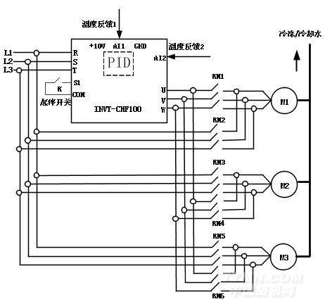 分別在主機蒸發(fā)器回水處、冷凝器出水及回水處安裝溫度傳感器,實時檢測管網(wǎng)的溫度,以模擬信號(0~10V或者4~20mA)反饋給變頻器,通過變頻器內置的PID運算輸出相應的頻率指令后自動調節(jié)水泵轉速,從而調節(jié)各循環(huán)水的熱交換速度,最終實現(xiàn)對室內恒溫度的控制。需要特別說明的是,變頻器內部在設計上集成了溫差反饋處理功能,系統(tǒng)無須另配專用控制模塊。