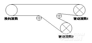 雙滾筒驅動帶式輸送機有兩種形式,一種是雙滾筒共同驅動,另一種是雙滾筒分別驅動。雙滾筒共同驅動其實質和單滾筒驅動一樣,兩個滾筒由1:1的齒輪連接。雙滾筒分別驅動其原理類似于兩個單滾筒驅動,兩個滾筒由2臺電機拖動。雙滾筒分別驅動帶式輸送機的原理示意圖如下: