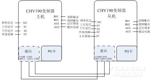 主從控制是一種分配兩電機或多個電機間的負荷使其達到均勻平衡的控制方式,當一個傳動設備是由兩個或多個電機驅動的時候,同時兩個電機或多個電機軸通過齒輪、鏈條或傳送帶等相互耦合在一起,就需要通過主從控制來分配各個電機間的負荷,以滿足控制精度。外部控制信號可以只與主機連接,主機通過一個串行通訊鏈路(CAN總線或者485總線)來控制從機。也可以主機和從機都連,通訊只傳遞主機轉矩信號。