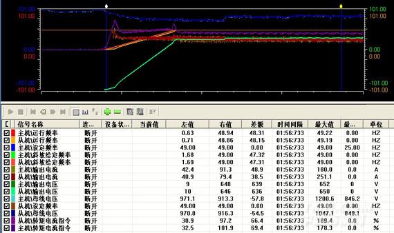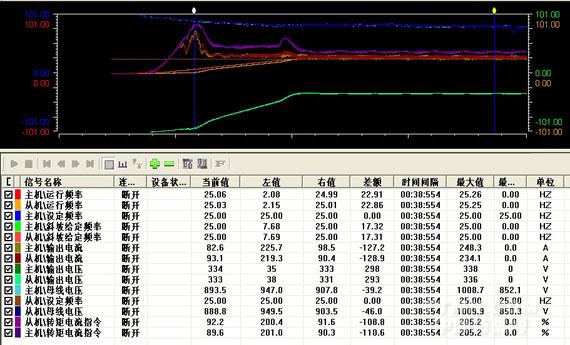此次CHV190中壓變頻器在雙滾筒分別驅動帶式輸送機上的應用,主機傳給從機的信號,采用了轉矩信號和電流信號,兩者都能實現功率均衡效果。從機在采用速度控制模式下,完全能滿足現場帶式輸送機的運行要求,運行穩定。完全到達了帶式輸送機的運行要求和用戶的要求。具體效果分析如下: