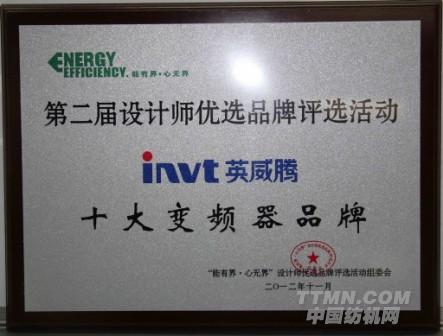 012年11月30日,英威騰在由賽爾傳媒、中國設(shè)計(jì)師網(wǎng)主辦的“第二屆設(shè)計(jì)師優(yōu)選品牌頒獎(jiǎng)盛典”中榮膺“設(shè)計(jì)師十大優(yōu)選變頻器品牌”和“誠信或作伙伴獎(jiǎng)”,連續(xù)兩屆蟬聯(lián)該項(xiàng)殊榮。