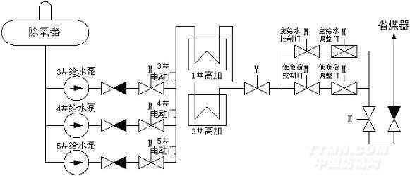 給水泵的任務是將除氧器貯水箱內的具有一定溫度的給水,通過給水泵產生足夠的壓力打入汽包,汽包內汽液分離,水送入熱鍋爐,在鍋爐環冷壁中加熱產生蒸汽后進入蒸汽輪機作功,帶動發電機組發電。根據電能生產的特點和熱鍋爐運行的特殊要求,給水泵必須連續不斷地運行。這不僅關系到正常發電,而且也直接關系到鍋爐設備的安全。因此,鍋爐給水泵在發電廠是最為重要的水泵,號稱發電機組的心臟。給水泵工藝流程如下圖1所示: