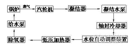 汽輪機做功后的尾氣大部分蒸氣被凝結器循環冷卻水冷凝成水,凝結水進入熱井中,由凝結泵(兩用一備)抽出,經軸封冷卻器和水位自動調整裝置后,一部分通過低壓加熱器經過加熱后送至除氧器;另一部分通過再循環調節閥回到熱井中,保證熱井液位。凝結水泵工藝流程圖如下圖2所示: