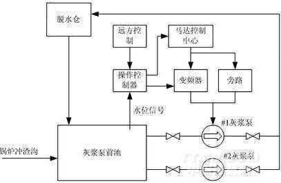 灰漿泵是根據前池液面的高度決定啟、停電機。這樣就存在兩方面問題:一方面為了適應生產工藝要求,需要每天根據前池液位和沖灰管的需要不斷切換、啟停電機,前池液位高度得不到很好控制,而且頻繁工頻啟動電機對電機造成很大沖擊。灰漿泵工藝流程圖如下圖3所示: