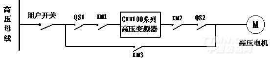 根據現場的額定參數和實際運行工況,再結合我公司的CHH100系列高壓變頻器在其它工程應用情況,我方提供的CHH100變頻器的旁路系統采用一拖一自動方案,變頻器具有轉速跟蹤功能,變頻與工頻能夠自動切換,其一次系統如下圖所示: