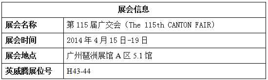 2014年4月15日-19日,第115屆廣交會(The 115th CANTON FAIR)將在廣州琶洲展館隆重舉行,屆時,英威騰將攜旗下工業自動化領域低壓變頻器、PLC、HMI觸摸屏、伺服等產品盛裝出席,全面展示英威騰在自動化行業內的最新產品和一體化解決方案。