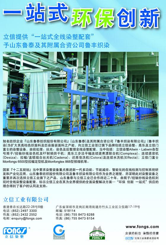 國家『十二五規(guī)劃』當中要求染整裝備重點推進新一代多功能、節(jié)能減排、智能化的在線檢測與控制系統(tǒng)研發(fā)和產(chǎn)業(yè)化應用,山東魯泰紡織股份有限公司及魯豐織染有限公司作為業(yè)界之翹楚,亦深明此對染整裝備之重要并再次選擇立信工業(yè)旗下之產(chǎn)品,山東魯泰與立信工業(yè)已合作將近二十年,由筒子/經(jīng)軸紗線染色機到現(xiàn)時全線染整設備配套,標示立信工業(yè)在其為業(yè)界提供的全面染整解決方案—“環(huán)保.創(chuàng)新.一站式”供應的理念得到了客戶的認同及支持。