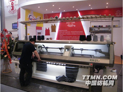據(jù)周經(jīng)理介紹,高亨精機于本屆展會亮相的產(chǎn)品是KF-300FF全電腦橫編織機。該設(shè)備在毛衣編織領(lǐng)域的特點尤其突出。設(shè)備采用一次成型技術(shù),極大程度為用戶企業(yè)簡化了生產(chǎn)步驟,提高了生產(chǎn)效率。設(shè)備在運行中可通過機器自帶的陶瓷口電子天線,自動調(diào)整運行速度,無需人工調(diào)整。同時為提高產(chǎn)品自動化程度,實現(xiàn)企業(yè)要求的全電腦控制系統(tǒng),設(shè)備操作界面采用觸控式彩色LCD顯示屏,工人可直接輸入花樣設(shè)計與程序動作指令,操作便捷,生產(chǎn)效率高。