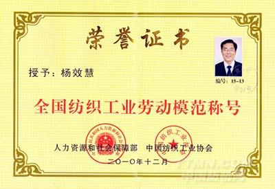 公司董事長楊效慧被授予全國紡織工業勞動模范
