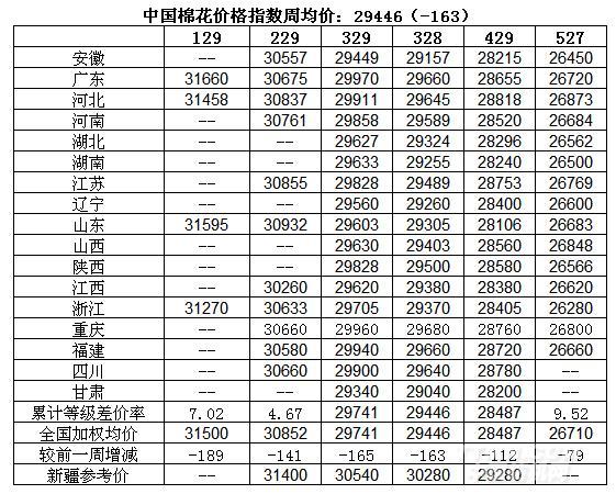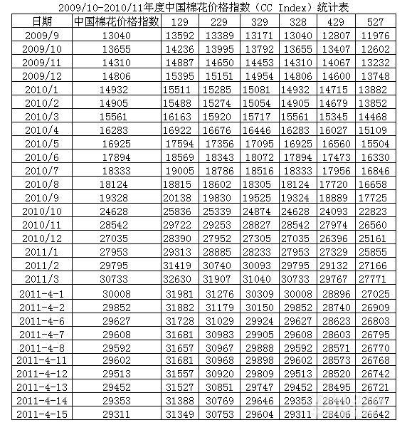 上周(4.11-4.15),紡織行業低迷,南半球新花上市銷售,國際電子盤走低,受其影響國內電子盤震蕩下行,皮棉現貨報價繼續下調,紡織廠毫無采購熱情,現貨市場難以動銷。越來越多的中小型紡織廠停產或減產,大廠減少棉花使用量。各地春播工作陸續展開,由于近兩天全國氣溫回升明顯,新疆地區播種速度加快;全國其他直播棉區或是制缽棉區播種也陸續展開。周末央行年內第四次上調存款準備金率,預計市場將凍結銀行資金3600多億元。當周中國棉花價格指數(CC Index328)周均價29446元/噸,較前周跌163元;229級30852元/噸,跌141元;527級26710元/噸,跌79元。