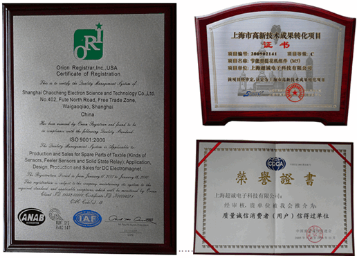 超誠電子科技有限公司在產品開發領域:成功研發出提花機電磁鐵、抬緯電磁鐵、電子多臂機電磁鐵、儲緯器電磁針、接近開關、緯紗傳感器、光電開關、光電探緯器、固態繼電器等產品,部分產品獲得了國際UL認證、CE認證等,受到了國部委的多次嘉獎。特別是本公司的高頻率提花機電磁鐵(SZT-003)、電子多臂機電磁棒(SZT-001-20)、節能型提花機組件(M5)、新型氣閥電磁鐵(TAU-2536),成為了國家商新技術產品,并通過了上海市高新技術成果轉化,得到了國家重點產品保護,本公司也被確認為全國質量、信譽雙保障示范企業,中國質量誠信委員會AAA級質量誠信會員,中國質量誠信促進會質量誠信消費者(用戶)信得過單位。