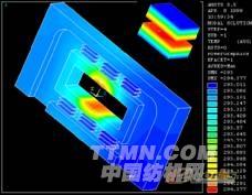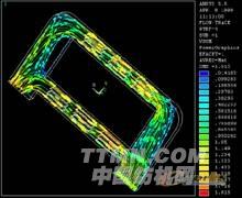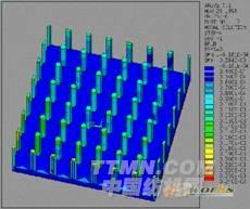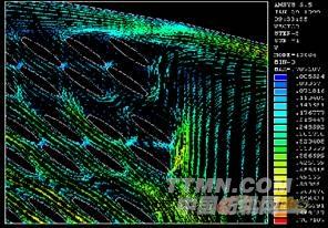圖7-1、7-2采用ANSYS CFX對某機載電子產品進行水冷分析,圖示為散熱冷板上的溫度分布和冷卻水的流線圖。