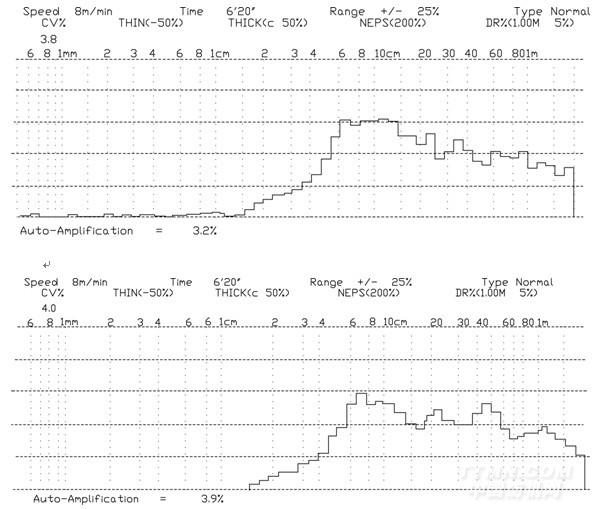 a)在高速380鉗次/min工作時,40㎝左右有較低的接合波,而在330鉗次/min以下工作時,無明顯的結合波,機械狀態良好,性能穩定可靠,能滿足現代高效精梳工藝的質量要求。