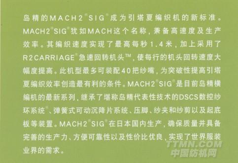 島精的MACH2SIG成為引塔夏編織機的新標準,MACH2SIG猶如這個名字,是目前島精橫編機的最新系列,繼承了堪稱島精代表性技術的DSCS數控紗環系統。
