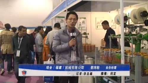 蔡經(jīng)理:觀眾朋友們好,我是福建項全機械有限公司的,這次參加義烏的展會,我們帶來了一些全新的設備和一些技術上的創(chuàng)新,包括面前這臺高速走碼機,機器型號是16錠的,以前是無線傳的現(xiàn)在改成記碼的,而且機器自動卷繞,可以節(jié)省人工成本,這是一個創(chuàng)新,節(jié)約人工成本。這邊的是新的紡紗機,在原來的機型上我們做了一些花色上的創(chuàng)新,經(jīng)過蛇形纏繞。目前這款設備主要用于服裝、鞋業(yè),包括汽車的坐墊和靠墊,包裝袋延繩都是可以的。我們這些設備的梳理,無極調(diào)速這些都是在行業(yè)里領先的。在客戶提出的要求的基礎上針對客戶的需求進行開發(fā),目前在市場的各個行業(yè)都有蠻多的應用。謝謝大家!