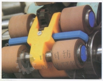 負(fù)壓羅拉紡紗裝置是以普通的三羅拉長(zhǎng)、短膠圈牽伸裝置為基礎(chǔ),保留中羅拉,上、下膠圈和后牽伸區(qū)結(jié)構(gòu),在相當(dāng)于原來(lái)前下羅拉的位置,將前羅拉替換成表面有條形通槽的中空大集聚羅拉,在集聚羅拉內(nèi)部有位置固定的吸風(fēng)內(nèi)膽構(gòu)件。在直徑為50mm集聚羅拉圓柱面上。由最前方的輸出阻捻膠輥和原來(lái)的前膠輥所控制的圓弧區(qū)構(gòu)成集聚區(qū)。須條由集聚羅拉輸送到雙膠輥控制的集聚區(qū)弧面時(shí),空氣有進(jìn)氣口、空氣導(dǎo)向器導(dǎo)引,透過(guò)條形通槽和纖維束,從緊貼吸風(fēng)口構(gòu)件槽形吸口,經(jīng)吸風(fēng)內(nèi)膽構(gòu)件,排向中央吸風(fēng)系統(tǒng)。在此過(guò)程中,纖維受到自上而下,和邊緣到中心的集聚約束。由槽形吸風(fēng)的寬度自后向前收縮,并且與主牽伸方向偏斜,空氣吸力還產(chǎn)生使受控纖維須條環(huán)繞自身由軸線的切向力矩,起到使外層纖維扭轉(zhuǎn)包覆的效應(yīng)。以上幾方面的綜合作用,使纖維在須條中,保持緊密順直,比較光滑的狀態(tài),通過(guò)輸出阻捻羅拉鉗口進(jìn)入加捻區(qū),加捻為緊密紗。