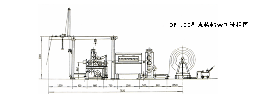 DF-160型點粉粘合機是制造領襯的專用設備,領襯坯布經進布架,電動吸邊器,擴布管,進入熱油輥,使坯布預熱,在坯布上部設粉點輥一根,粉料經粉斗均勻分布在粉點輥上,經轉動后,涂在預熱后的坯布上,再進高溫烘粘涂料,經冷軋,冷卻后卷裝成布盤。該機生產的領襯料有輕、薄、軟、挺等特點,以適應中高檔襯衣的領襯生產。