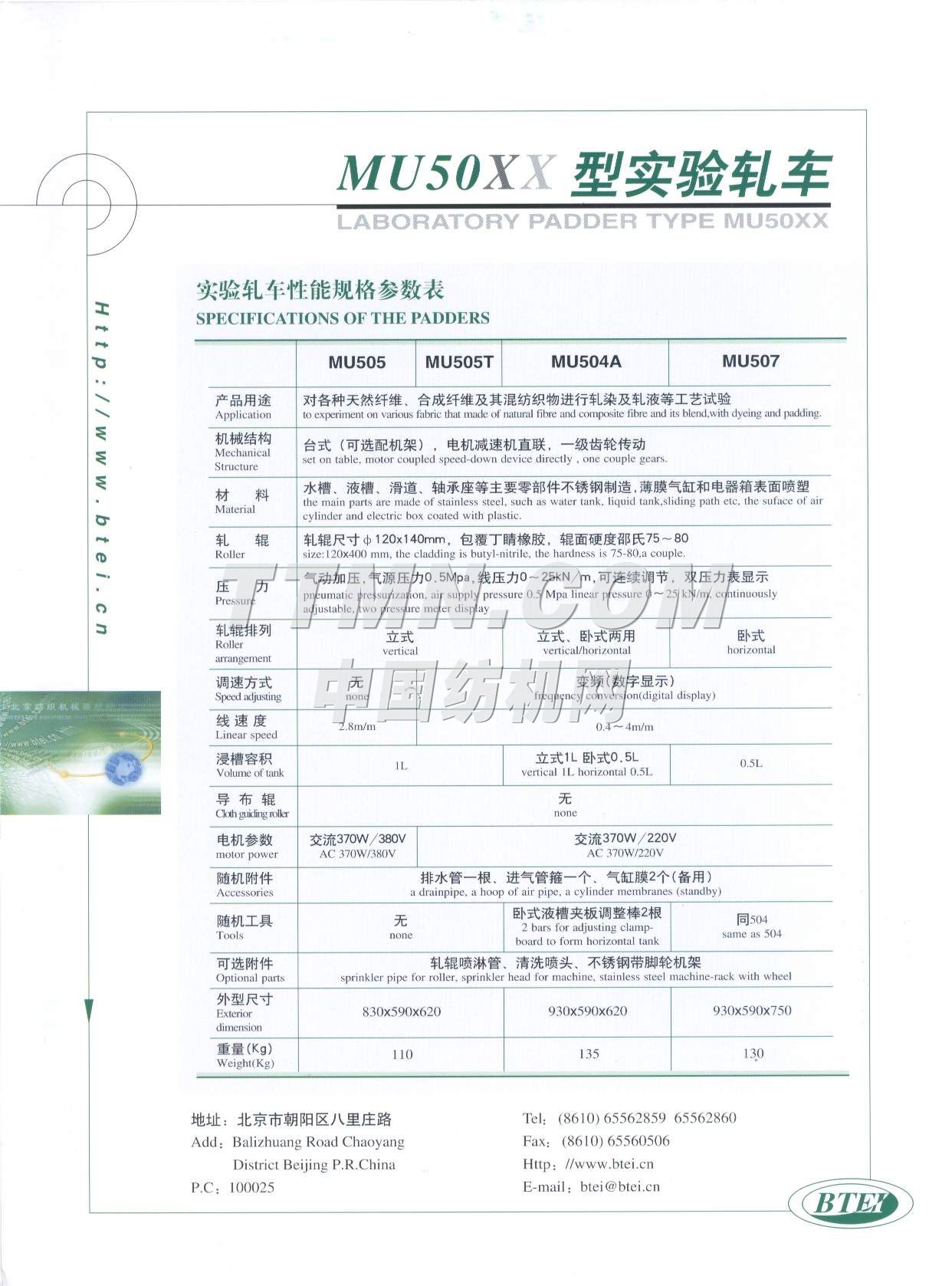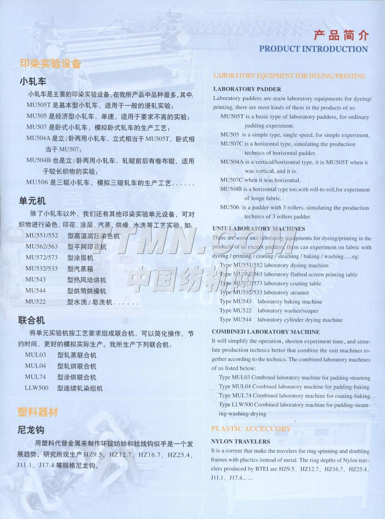 北京紡織機(jī)械器材研究所原是北京市紡織機(jī)械器材工業(yè)公司內(nèi)部的研究所,1986年分立。自八十年代初開(kāi)始,在原紡織部裝備司專家組的指導(dǎo)下,在赴西歐調(diào)研、引進(jìn)進(jìn)口染整實(shí)驗(yàn)設(shè)備技術(shù)、消化吸收國(guó)產(chǎn)化的基礎(chǔ)上,針對(duì)國(guó)內(nèi)市場(chǎng)需求,經(jīng)過(guò)近二十年的不懈努力,陸續(xù)研制了二十多種具有國(guó)內(nèi)先進(jìn)水平的染整實(shí)驗(yàn)設(shè)備和專用實(shí)驗(yàn)流水線,這些裝備正在全國(guó)近百家企業(yè)和高等院校發(fā)揮著重要作用。
