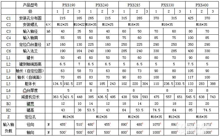 角標“”在輸入轉速3000rpm時,使用壽命作用于輸入軸中心位置(L/2處)之容許徑向力及軸向力備注:PXS系列除轉動慣量與系列不同外,其余參數均可參考對應的系列