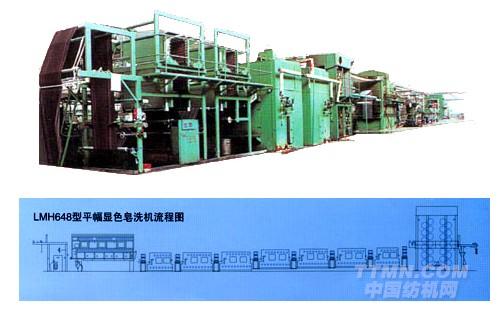 平幅進布→二輥臥式軋車→偶爾透風架→還原蒸箱→四格不銹鋼平洗槽→氧化透風架→鑄鐵帶蓋平洗槽→皂蒸箱→長蒸箱→鑄鐵帶蓋平洗槽→敞口平洗槽→二柱烘筒烘燥機槽→平幅落布