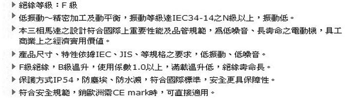本三相馬達(dá)之設(shè)計(jì)符合國(guó)際上重要性能及品管規(guī)範(fàn),為低噪音、長(zhǎng)壽命之電動(dòng)機(jī),具工 商業(yè)上之經(jīng)濟(jì)實(shí)用價(jià)值。