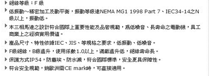 臺(tái)灣高崎立式高效率電機(jī) 產(chǎn)品系列:AEHL/AEUL系列(JIS/CNS系列) 馬力(HP): 1/4HP~100HP(0.18KW-75KW)極數(shù)( P ):2、4、6 電壓( v ):200~460 頻率(Hz): 50、60 框號(hào)(F#): 63~250 保護(hù)方式: IP54 絕緣等級(jí): F 級(jí) ●高效率~提升能源使用效率,比原標(biāo)準(zhǔn)系列損失降低10%~30%,運(yùn)轉(zhuǎn)越久,節(jié)省的電費(fèi)越多。 ●低振動(dòng)~精密加工及動(dòng)平衡,振動(dòng)等級(jí)達(dá)NEMA MG1 1998 Part 7、IEC34-14之N級(jí)以上,振動(dòng)低。 ●本三相馬達(dá)之設(shè)計(jì)符合國(guó)際上重要性能及品管規(guī)范,為低噪音、長(zhǎng)壽命之電動(dòng)機(jī),具工、商業(yè)上之經(jīng)濟(jì)實(shí)用價(jià)值。 ●產(chǎn)品尺寸、特性依據(jù)IEC、JIS、等規(guī)格之要求,低振動(dòng)、低噪音。 ●F級(jí)絕緣,B級(jí)溫升,使用系數(shù)1.0以上,滿載溫升低,絕緣壽命長(zhǎng)。 ●保護(hù)方式IP54,防塵埃、防水濺,符合國(guó)際標(biāo)準(zhǔn),安全更具保障性。 ●符合安全規(guī)范,銷歐洲需CE mark時(shí),可直接適用。 ●高效率馬達(dá)群組系列化,產(chǎn)品齊全符合各國(guó)際法規(guī),具跨市場(chǎng)之泛用性。