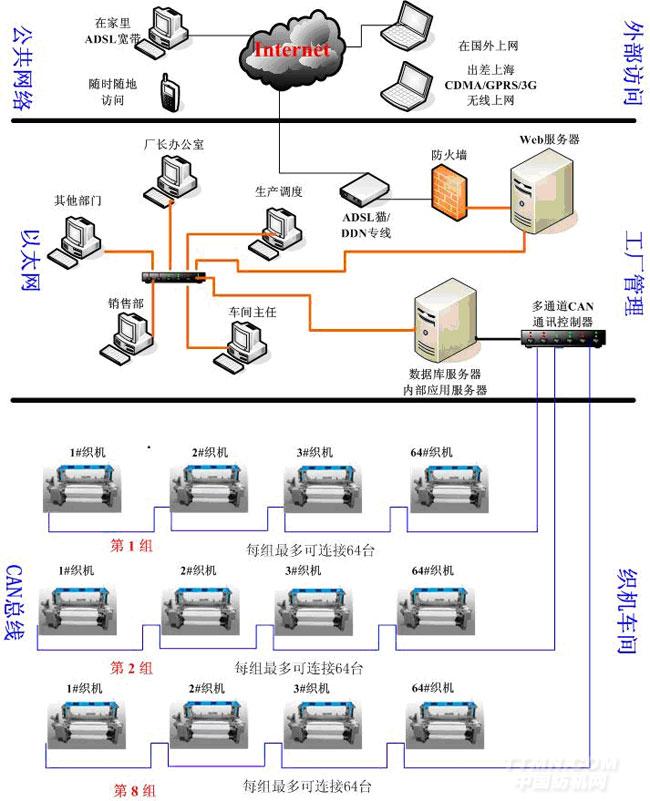 二、PsZJYB織機在線驗布單元的組網。本單元可以用以太網或CAN總線組網運行;針對該設備的網絡化管理我們分為3個層次,充分利用最新計算機控制技術和網絡技術,組成一個完整而有效的網絡架構,為紡機企業的信息化提供真實和翔實的數據; 完整的網絡架構圖如下圖所示: