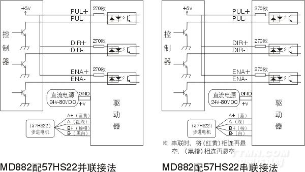 脈沖控制信號:脈沖上升沿有效;PUL-高電平時4-5V,低電平時0-0.5V。為了可靠響應脈沖信號,脈沖寬度應大于2.5μs。如采用+12V或+24V時需串電阻。