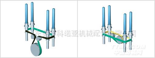 皮帶安裝之前,請去除并清掃皮帶附著的油膩、潤滑油、棉絮等。如皮帶附著有異物或污垢,會成為錠子轉動異常、皮帶行走異常等原因。 安裝的時候,必須先請放松張緊輪等的張力調整機構的基礎上再進行。 根據皮帶上的印章來確認皮帶表面和背面,另外,確認皮帶是否有跳上法蘭或有與機臺的不必要接觸。 在安裝皮帶的時候,盡量避免勉強地翹上皮帶或彎折皮帶,都會成為皮帶早期損壞的原因。 如沒有張緊輪等調整機構時,請將布料等貼在皮帶輪上的邊緣部分,以便保護皮帶。