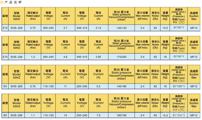 單段鼓風機EHS329/339工作原理離心式風機重量14.5 高壓風機 :采用德國先進技術,在通過加上一體式的銷音設施,改進了高壓風機靜音現像,而提升了靜音的效果2、可靠性高當使用情況變化時,機器仍可安全運轉。除了葉輪之外,高壓鼓風機沒有其他動作,因此可靠性之高幾乎免維修。使用獨一無二且散熱良好的精密外側軸承,因此它具有下列優點:高壓縮比;軸承運轉溫度低;潤滑油脂壽命長;免保養。 3.安裝容易 配備齊全,可隨時安裝與使用,供壓縮空氣或用于抽真空,也可任意安裝于水平或垂直的方向。 4.無油無污染 葉輪旋轉時,不與任何部分零件接觸,免潤滑,因此可保證百分之百無污染。 5.最高品質 經過17年的專業制造經驗,最精密機械設計加上慎重電機配合標準儀器測試,使用所有零件均能達到最高品質要求,運用標準ip54,f級馬達效率高,故障極少,馬達與鼓風機之間有軸封分試,預防異物進入。同時為確保功能效果,每一臺鼓風機在出廠前均經過嚴格測試。 6.電壓:萬國電壓型,50HZ 60HZ均可用,無論您的產品是出口至歐美的使用60Hz,高電壓的國家,還是中東,非洲等使用50Hz電壓的國家及地區,本風機均能達到要求,功能產齊全,讓您無后顧之憂! 適應行業:劍桿織機、絲網印刷機、成像機、照排機、切紙,醫療設備,食品機械,各式燃燒機,鍋爐設備,環保設備,木工機械、除塵設備,pcb設備,除濕干燥機清洗設備,,吸塵設備,公共場所供氧,干洗設備,等等。
