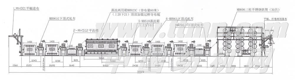 平幅進布→MH518蒸洗箱→MH961G軋車→MH518蒸洗箱→MH961軋車→MH512平洗槽→MH961軋車→MH923C汽蒸箱→MH961軋車→MH518蒸洗箱→MH961軋車→MH518蒸洗箱→MH961軋車→MH518蒸洗箱→MH961軋車→MH512平洗槽→MH961軋車→MH606三柱烘燥機→平幅、打卷落布