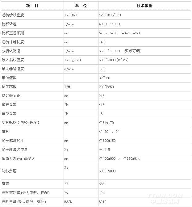 >>高產。轉杯最高轉速可達110,000轉/分,引紗速度最高為170米/分,紡紗器頭數最大可增加到352頭