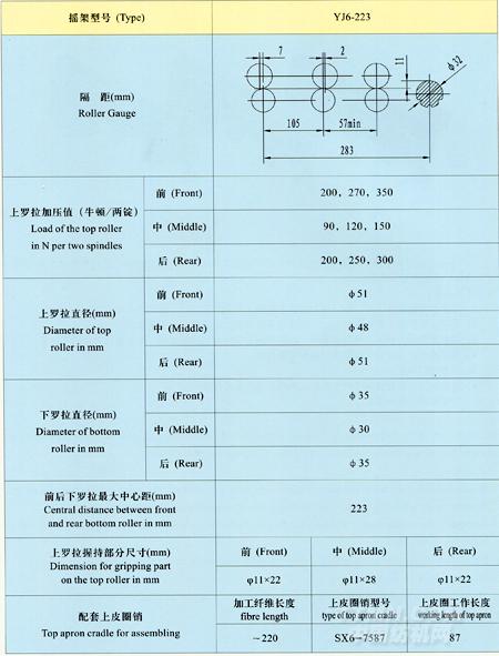 YJ6-223型搖架用于三羅拉雙皮圈牽伸型式的毛紡細紗機,適紡纖維長度為220毫米以下的毛、化纖的純紡和混紡。