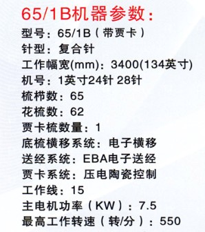65/1B花邊機具有國內目前頂級技術的多梳與賈卡結合的多梳經編機。其特點如下:1.采用最先進壓電陶瓷賈卡與新型的鋼絲多梳技術復合,機器性能更加穩定可靠。2.采用賈卡形成多變的底布花式,具備獨特的底布風格。3.地梳采用EBA電子送經,以及電子牽拉和卷布,且電腦操作方便簡潔,界面清晰。4.先進的鋼絲多梳輕便可靠,使花型圖案更加清晰。5.花梳的獨特單卡控制補償,確保了花梳運行的高精度。
