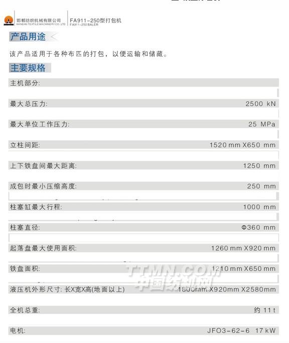 您所在的位置:紡機(jī)網(wǎng) > 產(chǎn)品庫 > FA911-250型 液壓打包機(jī)