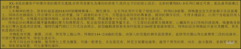 您所在的位置:紡機(jī)網(wǎng) > 產(chǎn)品庫 > BX-D-GJ雙面花盤提花針織圓緯機(jī)