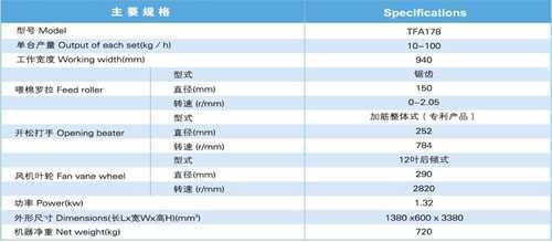 本機是梳棉機與清花機組之間的連接裝置。采用上下棉箱結構,整體剛性好,精度,密封性好。在配棉總管中,設有壓力傳感器,保證了上棉箱內棉花密度均勻。下棉箱采用風機和通過靜壓擴散而裓-環吹氣,使整個機副內下棉箱壓力均勻。采用進口壓力傳感器,根據下棉箱壓力來控制上棉箱給棉羅繺-速度,保證了下棉箱壓力更穩定。采用順向喂棉、彈性握持。采用螺旋排列加筋整體式梳針打手(國家專利產品),纖維無損傷,主機采用全中文觸摸屏PLC程序控制器智能控制,操作簡單。