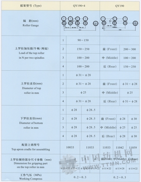 QYI 90型氣囊直接加壓式粗紗機搖架具有結(jié)構(gòu)簡單、性能優(yōu)越、加壓穩(wěn)定可靠和使用方便等優(yōu)點,其中三羅拉適月于纖維長度為60毫米以下的純棉、化纖或混紡,四羅拉適月于纖維長度為50毫洙以下的純棉、化纖或混紡。
