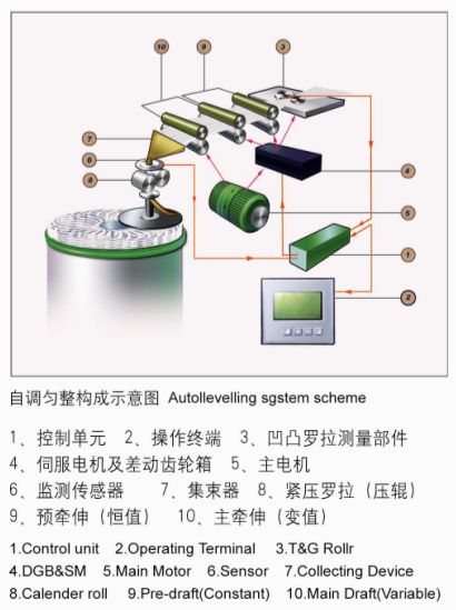開環控制系統的自調勻整系統:喂入棉條在經過檢測羅拉時被檢測,檢測的信號被存入記憶器,在有支數偏差的棉條進到主牽伸區時,控制器將信號與標準值比較,通過伺服電機與差速(差動)齒輪箱改變主牽伸區的牽伸倍數,使有偏差的棉條得以校正,實現了牽伸的自動調控,獲得高質量的輸出棉條。在輸出端,能自動檢測輸出棉條的質量,并顯示支數等變化,當變化值超過規定的極限值時,令機器自動停止。其勻整范圍均為±25%,可有效消除精梳棉條的搭接波,減少出條的重量偏差,減低不勻率。