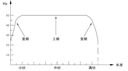 在小紗與大紗時(shí),主電機(jī)由變頻驅(qū)動(dòng),中紗時(shí)由工頻驅(qū)動(dòng)??捎行Ы档凸?,延長變頻器使用壽命。