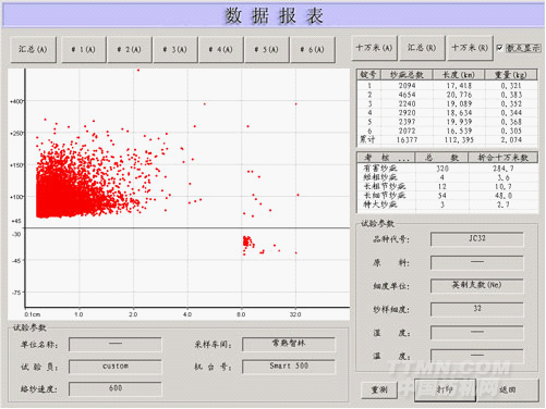 ● 其他數據:顯示單錠或匯總的疵點總數,實際測試長度,折合紗線重量。
