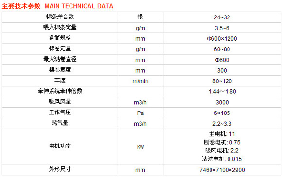 條筒位于導棉平臺一側,操作方便,高架導條,積極喂入,有效防止棉條的不良牽伸,牽伸機構走棉方向與導棉平臺一致,棉條進入牽伸機構前實現轉向。